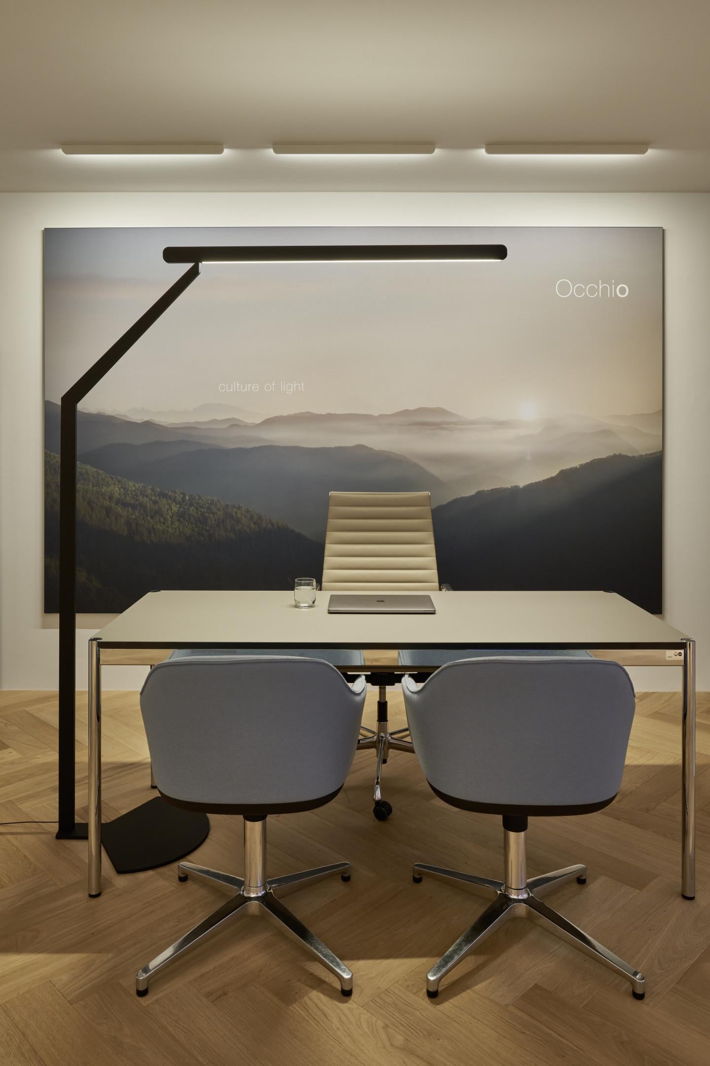 Control is touchless, directly on the head or at seating height via the »body sensor«. With Mito terra 3d, the light can be controlled not only with gestures or Occhio air, but if desired also without any effort at all on your part: the »presence sensor« responds to your presence or absence and controls the light automatically and efficiently.